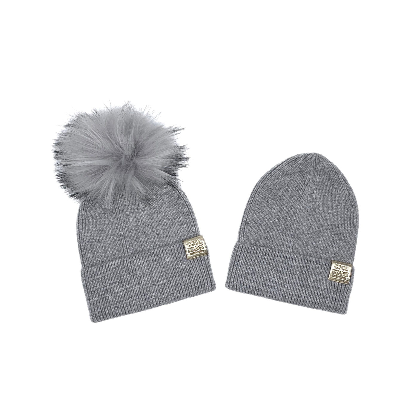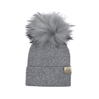 Buttery soft cashmere blend beanz with signature CB label. Natural Faux removable pom.
